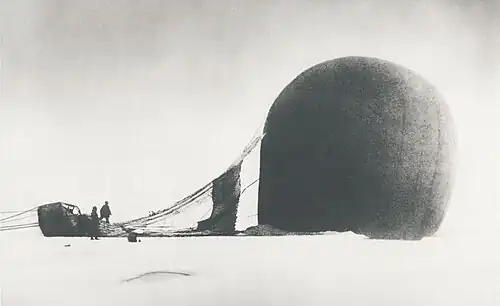 Первую документированную попытку проникнуть в воздушное пространство над Северным полюсом предприняли швед Саломон Андре и его два спутника — Нильс Стриндберг и Кнут Френкель. 11 июля 1897 года они отправились на воздушном шаре «Орёл» с острова Датский архипелага Шпицберген в сторону Северного полюса. Известно, что экспедиция преодолела 475 километров, из-за утечки водорода в воздушном шаре села 14 июля на льды, после чего была вынуждена отправиться обратно пешком. Им удалось добраться до острова Белый, где они и погибли. Известно об этом стало только в 1930 году, когда останки исследователей были случайно обнаружены[52].