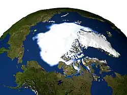 Толщина льда на Северном полюсе составляет обычно 2—3 метра[64], хотя бывают значительные изменения. Территория океана, покрываемая льдами, летом почти в два раза меньше, чем зимой[64]. Иногда, из-за передвижений масс льда, на Северном полюсе обнажается поверхность океана. Исследования показали, что площадь покрытия и средняя толщина льда в Арктике уменьшились в последние десятилетия, что многие связывают с последствиями глобального потепления[64]. В сентябре 2007 года на Северном полюсе был зафиксирован рекордно низкий уровень льда[66]. Некоторые исследователи предсказывают, что через несколько десятилетий Северный Ледовитый океан будет полностью освобождаться ото льда на летние месяцы. Таяние льдов может привести со временем к повышению уровня моря и другим глобальным климатическим изменениям[64].