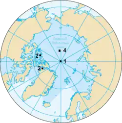 Ближайшим участком суши к Северному полюсу считается либо остров Каффеклуббен, либо остров ATOW1996; а ближайшим населённым пунктом — поселение Алерт на острове Элсмир (территория Нунавут, Канада) в 817 километрах от Северного полюса.