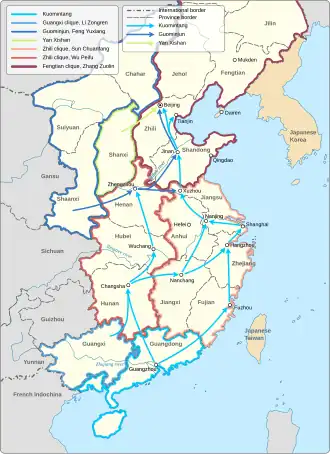 Летом 1926 года силы милитаристов располагались следующим образом: Маньчжурия, провинция Шаньдун и центральный район Пекин-Тяньцзинь контролировались фэнтяньской кликой, главарями которой были Чжан Цзолинь и Чжан Цзунчан. Центральный Китай (юго-запад провинции Чжили, Хэнань, восточная часть Шэньси, Хубэй, Хунань) контролировались чжилийской кликой во главе с У Пэйфу. Восточный Китай (провинция Цзянсу с Шанхаем, а также Аньхой, Чжэцзян, Цзянси, Фуцзянь) контролировались маршалом Сунь Чуаньфаном, отколовшимся от чжилийской клики.