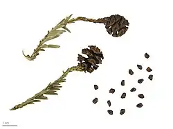 Шишки яйцевидной формы, длиной 15—32 мм, с 15—25 спирально закрученными чешуйками; опыление происходит в конце зимы, созревание — спустя 8—9 месяцев. В каждой шишке находится 3—7 семян, каждое из которых имеет 3—4 мм в длину и 0,5 мм в ширину. Семена высыпаются, когда шишка высыхает и открывается.