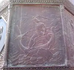 Барельеф, изображающий главного героя поэмы — Бахрама, убивающего дракона, исполнен скульптором А. Хрюновым по эскизам художника Газанфара Халыкова[44] на постаменте памятника Низами Гянджеви в Баку, установленного в 1949 году.