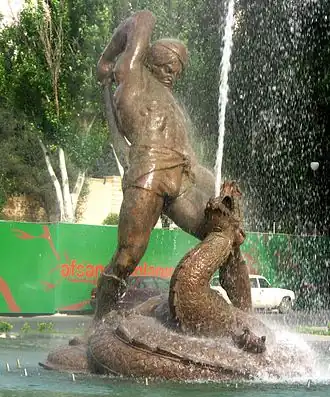 В 1959 году в Баку была установлена бронзовая скульптура-фонтан «Бахрам Гур», изображающая героя поэмы[45] Бахрам-Гура, убивающего мечом змееобразного дракона, обвившегося у его ног. Авторы — Аслан Рустамов, Альберт Мустафаев и Горхмаз Суджаддинов[46]. Следует отметить, что данная скульптура является первым в Азербайджане скульптурным памятником литературному герою одной из поэм Низами Гянджеви[47].