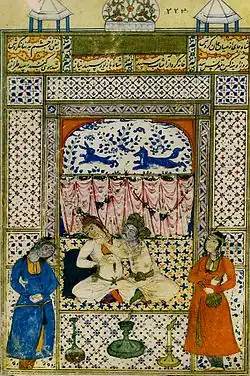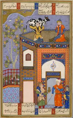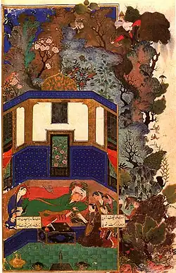 ![]() Бахрам Гур в бирюзовом дворце. Миниатюра 1524/25 года. Гератская школа. Метрополитен-музей, Нью-Йорк | |