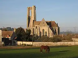 Снаружи апсида имеет контрфорсы, которые придают устойчивость всему зданию и позволяют реализовать так называемую технику «тонких стен» (mur mince), придающую изысканность пространству интерьера. Архитектура церкви была изменена в XV веке, когда с обеих сторон были пристроены капелла Девы Марии и сакристия. Многоугольная в плане капелла Девы Марии имеет высокие окна, украшенные фронтонами, на которых когда-то стояли статуи. Наличие украшенных башен и гaргулий характерно для стиля зрелой готики. Церковь претерпела многие разрушения. Колокольню было решено построить в начале XIII века, но её строительство было завершено только в XV веке. Первый этаж башни представляет собой открытый с трёх сторон портал. Над ним возвышаются три этажа башни. Два северных и восточный фасада целы, западный разрушен, южный полностью обрушился. В центре северного входа расположен портал Страшного суда, схожий с порталами Собора Парижской Богоматери.