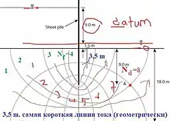 Сетка линий равных напоров,поточная сеть (англ. Flow net) — графическое представление потока подземных вод через водоносные горизонты. Если ограждение является несовершенной противофильтрационной завесой (ПФЗ) и в котловане выполняется строительное водопонижение эффективные величины бокового давления водонасыщенных проницаемых грунтов вычисляют по формуле ,