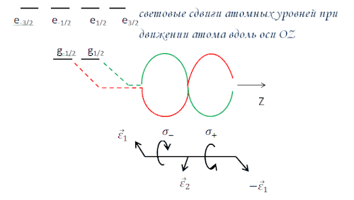 Атом окажется в потенциальной яме перехода , образовавшейся вследствие светового сдвига. Атом при этом спонтанном переходе с излучением фотона в случайном направлении теряет энергию, приобретённую вследствие поглощения фотона в направлении −OZ, то есть из-за анизотропии процесса составляющая скорости атома вдоль оси OZ уменьшится. Несколько другой баланс по энергии будет наблюдаться при другом переходе.