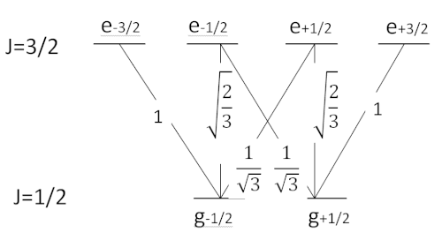 Модельная энергетическая структура атома показана на Рис. 2. Из этой диаграммы видно, что переходы между уровнями под действием света в зависимости от его поляризации происходят с разной вероятностью.