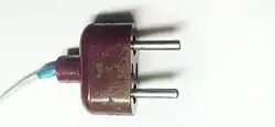 | Штырь, штифт | Контакт вилки цилиндрической формы. В США в применяются плоские контакты, обычно называемые «ножами» («blade»), или «зубьями» («prong») |