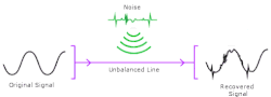 При обычном, несимметричном подключении[1] соединение происходит посредством только одного сигнального провода и одного общего провода (часто в виде экранной оплётки кабеля), по которым и передаётся сигнал. В большинстве случаев это дает приемлемый результат на небольших расстояниях, до 5-7 метров. При увеличении длины кабеля увеличивается воздействие внешних помех на сигнал, что в некоторых случаях бывает неприемлемым. Если рядом с такой простейшей системой начать разговаривать по мобильному телефону или где-то поблизости окажется силовой кабель, электромагнитные волны от телефона и магнитные поля кабеля начнут наводить электрические сигналы в проводах нашей несимметричной схемы. Если при таких обстоятельствах прибором в схеме является, например, микрофон, аудитория будет «порадована» жужжанием и визгом. Поэтому несимметричное соединение — это не всегда лучшее соединение. Чем длиннее несимметричный кабель, тем больше вероятность возникновения помех, поэтому не рекомендуется использовать несимметричный кабель длиной более 3 метров. Такой вид кабеля можно часто увидеть в домашней аудиоаппаратуре (в непрофессиональных комплектах звуковой техники в основном все кабели несимметричные).