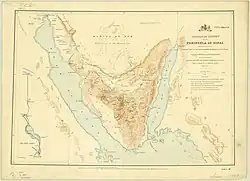Синай - это полуостров, имеющий форму клина, заострённого к югу, ограничен с севера побережьем Средиземного моря либо линией, соединяющей северные оконечности Суэцкого залива и залива Акаба[15]; с запада — Суэцким заливом, с востока — заливом Акаба. Поскольку границы полуострова условны, его территория в зависимости от методики определения оценивается в пределах от 25 тыс. до 61 тыс. км²[15]. Он связан с Африканским континентом Суэцким перешейком, полосой суши шириной 125 километров. Восточный перешеек, соединяющий его с материковой частью Азии, имеет ширину около 200 километров. Восточный берег полуострова отделяет Аравийскую плиту от Африканской плиты[16]. В основном территория занята пустыней, ближе к югу имеются горы (самая высокая точка это Гора Святой Екатерины, 2637 м) и плоскогорья. На полуострове открыты месторождения нефти, традиционно также добывалась бирюза.