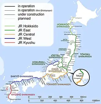 • Тюо-синкансэн (Токио-Нагоя-Осака) является запланированной линией Маглев. JR Central объявила об установленном сроке постройки — 2025 год. Кроме короткого экспериментального участка, строительство ещё не началось.