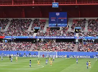 16 марта 2018 года Совет ФИФА на Конгрессе в Боготе постановил, что система VAR будет применяться на чемпионате мира в России[47][48][49]. Первое использование системы VAR на чемпионате мира состоялось 15 июня во время матча в группе B между сборными Испании и Португалии в Сочи. На 24-й минуте встречи форвард сборной Испании Диего Коста при счёте 1:0 в пользу Португалии вступил в единоборство с португальским защитником Пепе, ударив его локтем в лицо. Пепе упал на землю, но судья не остановил встречу, а Коста в итоге нанёс завершающий удар по воротам, сравняв счёт. Судивший встречу Джанлука Рокки обратился по наушнику к видеоассистенту, находившемуся в Москве и наблюдавшему за ходом матча по нескольким мониторам. Видеоассистент заявил, что нарушений в действиях Косты не было, и Рокки засчитал гол. Сам же Коста после игры сказал, что не был уверен, стоило ли ему праздновать его, поскольку сам сомневался в том, что мяч был забит по правилам[25]. 16 июня на матче в группе C между сборными Франции и Австралии судья впервые на чемпионате мира назначил пенальти при использовании системы VAR[50]. По итогам турнира ФИФА отметила, что внедрение VAR крайне положительно сказалось на работе судей[51].