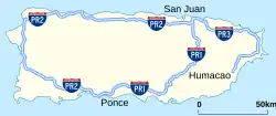 ![]() Шоссе между штатами в 48 смежных штатах. Аляска, Гавайи и Пуэрто-Рико также включены в систему межштатных автомагистралей США. (См. версию с номерами.) | |