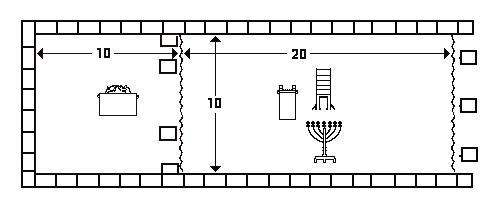 - Меньшее помещение в глубине было размером 10×10×10 локтей и называлось «Святая Святых» (Кодеш ха-кодашим), в нём находился только Ковчег Завета (Арон ха-брит), самый святой предмет Скинии, а в нём — Скрижали Завета (Лухот ха-брит).