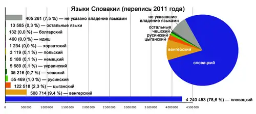 Основной ареал словацкого языка — территория Республики Словакии. Согласно переписи, проведённой в Словакии в 2011 году, в качестве родного языка словацкий назвали 4 240 453 человека (78,6 % населения страны), за словацким следуют — венгерский (508 714; 9,4 %), цыганский (122 518; 2,3 %) и русинский (55 469; 1,0 %)[14]. При этом в общественной жизни словацкий используют 4 337 695 жителей Словакии (80,4 %)[8], в качестве языка домашнего общения словацкий указали 3 954 149 человек (73,3 %)[16]. Подавляющее большинство носителей словацкого языка — этнические словаки. К этому этносу в Словакии отнесли себя 4 352 775 человек (80,7 %)[17].
