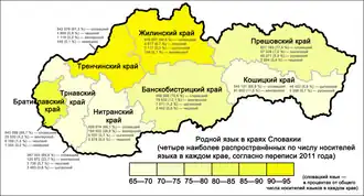 Носители словацкого языка проживают также на части территорий соседних государств, которые вместе со Словакией некогда входили в состав Венгерского королевства: в Венгрии (9888 из 29 647 венгерских словаков назвали словацкий родным, всего на нём в Венгрии говорят 16 266 человек, 2011)[18] и на Украине — прежде всего, в районах Закарпатья (2633 из 6397 словаков)[19][20]. Помимо этого, на словацком говорят жители ряда других территорий бывшего Венгерского королевства, не граничащих со Словакией: жители Румынии — в основном, в районах Трансильвании и Баната (12 574 из 13 654 словаков назвали словацкий родным, всего на нём в Румынии говорят 12 802 человека, 2011)[21], жители Сербии — прежде всего, в автономном крае Воеводина (49 796 из 52 750 сербских словаков назвали словацкий родным, при этом в Воеводине проживают 47 760 носителей словацкого из 50 321 словака, 2011)[22][23], и Хорватии — в основном, на востоке страны — в Вуковарско-Сремской и Осиецко-Бараньской жупаниях (3792 из 4753 хорватских словаков, 2011)[24][25].