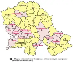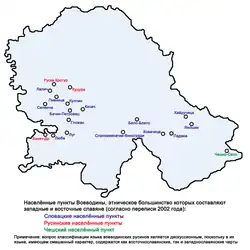 ![]() Карта регионов с присутствием носителей словацкого; регионы, где словацкий — язык большинства, выделены тёмно-синим | |