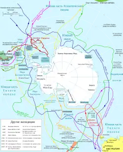 - ↑ Ход открытия Антарктиды после первой русской антарктической экспедиции. Глава 22. discover-history.com. — На основе книги «Очерки по истории географических открытий», авторы: И. П. Магидович, В. И. Магидович. Дата обращения: 26 октября 2018. Архивировано 17 апреля 2016 года.