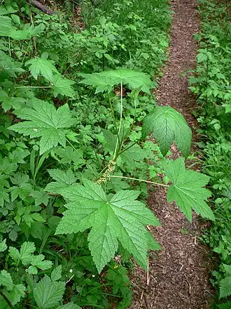 Листья длиной 2—10 см, яйцевидные в очертании, с сердцевидным основанием, на длинных (2—10 см) черешках. Листовая пластинка глубоко рассечена на 5—7 яйцевидно-ланцетных, заострённых на концах лопастей с остропильчатыми краями. Листья имеют сладковатый неприятный запах, за что этот вид получил английское название stink currant — вонючая смородина[3].