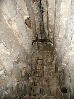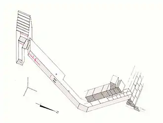 Второй вход, расположенный с западной стороны, находился на высоте 33,32 м от основания. При этом второй вход отлично сохранился, поскольку был закрыт поворотной каменной плитой с запорным механизмом, которая сливалась с облицовкой западной грани пирамиды. Входы на северной стороне пирамиды делали во времена Древнего царства. Это было связано с религиозными верованиями древних египтян. Почему здесь появилась потребность во втором, западном, входе — это остаётся загадкой. Довольно крутой наклонный коридор длиной 67,66 м вёл вглубь пирамиды. В конце наклонного коридора есть небольшая яма, которая могла служить защитой от попадания дождевой воды во время строительства. За ямой начинается горизонтальный коридор длиной около 20 м, на котором расположены два устройства с блокирующими проход камнями. Системы запирания уникальны тем, что они состояли не из обычных барьеров падающего камня, а скорее из камер с наклонной плоскостью, по которым барьерный камень мог скользить в нужное положение. Между двумя системами заграждения проходит шахта во всю ширину прохода. Как и все камеры, камеры запирающих камней имеют консольные своды. Наружная из двух запорных систем была заперта. Блокирующий камень стоит и сегодня, но в нём имеется прямоугольное отверстие. Внутренний запорный механизм никогда не был закрыт. Его запорный камень всё ещё удерживается в открытом положении деревянной балкой. Коридор приводит к так называемой верхней заупокойной камере. Размер камеры — 7,97×5,26 м, а высота — 16,5 м. Потолок выполнен в виде ложного свода, однако, из-за чудовищного давления верхних слоёв каменной кладки, он потерял геометрию и грозит обрушиться. В нижней части камеры находится обрешётка из кедровых брусьев, её назначение также остаётся неизвестным.