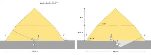Северный вход пирамиды находится приблизительно в 11,8 м над уровнем основания. Отходящий от него наклонный коридор длиной 78 м был частично выложен в массиве пирамиды, а частично вырезан в скале и спускался приблизительно на 25 м к центру основания. Высота коридора составляет всего 1,05 м, а ширина 1,10 м. Коридор заканчивается прихожей, размеры которой составляют 5,40 м в длину и 12,60 м в высоту, а шириной всего в 1,10 м, соответствующей коридору. Потолок вестибюля образует ложный свод из мощных известняковых блоков, сложенных в виде сужающейся вверх крыши. Такой ложный свод сделан для равномерного распределения давления находящихся сверху блоков пирамиды. На высоте 6,50 м от пола прихожей расположен проход в главную камеру северного входа. Это помещение имеет в высоту 17,2 м, при площади 4,96×6,30 м. Облицовка коридора и камер была выполнена из тщательно подогнанных друг к другу блоков белого известняка. Потолок главной камеры сделан также в виде сужающегося вверх ложного свода. На южной стороне главной камеры короткий проход ведёт в очень узкую и высокую вертикальную шахту, которая находится точно на оси пирамиды. Эта шахта известна в литературе, как «Печная труба». Шахта закрывается сверху небольшим ложным сводом. Ложный свод имеет и небольшое окошко, расположенное в нескольких метрах над проходом из главной камеры в «печную трубу».