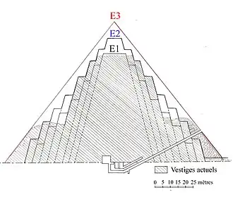 Первоначально эта пирамида была построена как ступенчатая и лишь на третьем или четвёртом этапе строительства её превратили в «истинную», заполнив уступы каменной кладкой. Реконструкция её архитектурной эволюции была для современных учёных нелёгкой задачей, и кто знает, как долго она оставалась бы неразрешённой, если бы на помощь египтологам не пришёл неизвестный древнеегипетский строитель[стиль]. При раскопках на известняковой плитке был обнаружен стилизованный чертёж, изображавший пирамиду сначала с двумя, а потом с тремя и четырьмя ступенями. Выполнил этот чертёж какой-то древний «прораб». К сожалению[стиль], не нашлось записи с его именем, неизвестно также, кому и когда пришла в голову идея заполнять уступы каменной кладкой и покрывать возникший таким образом ровный склон пирамиды сплошной облицовкой. Не сохранилось и прямого свидетельства о том, какой египетский царь повелел построить эту пирамиду.
