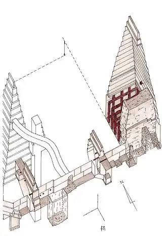 К востоку от Ломаной пирамиды находятся развалины маленького храма. Весь комплекс был огорожен каменной стеной двухметровой толщины.