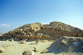 Первоначально это сооружение представляло собой ступенчатую пирамиду, состоящую из семи или восьми ступеней. Ныне солнце освещает лишь остатки её третьей и четвёртой ступеней. Первые две скрыты в окружающих развалинах, от пятой остался лишь небольшой выступ, от двух или трёх последних сохранились упавшие блоки; раскопки в её непосредственной близости позволили обнаружить множество отполированных известняковых облицовочных плит. Вход в пирамиду нашли в 1882 году рабочие Масперо; относительно того, кого считать первым исследователем, вступившим в её погребальную камеру, в литературе существуют разногласия: согласно «Египетским пирамидам» англичанина Эдвардса, это был француз Масперо, «Справочнику египетской археологии» француза Вандье — англичанин Питри. В камере были найдены лишь обломки деревянного гроба, который по стилю относят к эпохе Древнего царства. Исследователи ожидали найти саркофаг, которого там не оказалось. Однако, по размерам камеры (5,9 × 2,65 метра) сделан вывод, что она была рассчитана под саркофаг. То, что саркофаг некогда там находился, в первую очередь подтверждает толстая балка со следами каната, с помощью которого опускали саркофаг в камеру. Объяснением отсутствия саркофага является тот факт, что вынести саркофаг из этой пирамиды было легко.