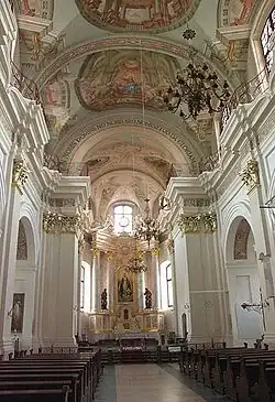 Собор Пресвятого Имени Пресвятой Девы Марии — трёхнефная базилика без трансепта. Пространство поделено на нефы шестью колоннами, центральный неф заканчивается полукруглой апсидой, по бокам которой расположены две капеллы — св. Троицы и св. Фелициана[2]. Главный фасад в стиле виленского барокко обрамлён двумя башнями. Башни многоярусны, над уровнем центрального карниза возвышаются три яруса, башни увенчаны крестами. Над портиком главного фасада находится треугольный фронтон, над карнизом портика расположен балкон с балюстрадной оградой.