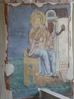 Под этими фресками крепился темплон алтарной преграды, в котором первоначально вероятно не было других икон, кроме образов Спасителя и Богоматери. Алтарь закрывала крепившаяся к темплону завеса. На неё намекают изображенные в нижней части столбов полотенца[3].