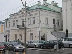 Двух и трехэтажное здание. Памятник архитектуры. Дом, известный как «Дворец Сангушек», имеет давнюю историю. Построен в 1742 г. на месте городской таверны 16 века. Во второй половине 18 в. им владел Антоний Тизенгауз, а затем его наследники. В 20 в. в доме находились: мастерская гродненского фотомастера Гельгора, аптека, магазин канцтоваров, магазин Линника по продаже швейных машин, велосипедов, мотоциклов, радио—фототоваров. После войны располагались промтоварные и продовольственные магазины, пивной ларек. В 1962 году открылась диетическая столовая. После закрытия столовой там некоторое время располагался магазин «Игрушки». В 70-80 г.г. в здании работали парикмахерская и магазин «Союзпечать».