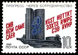 - ↑ Название организации на языках стран-членов и наблюдателей: алб. Këshilli i Ndihmës Ekonomike Reciproke, KNER, англ. Comecon, The Council for Mutual Economic Assistance, араб. مجلس التعاون الاقتصادي, болг. Съвет за икономическа взаимопомощ, СИВ, венг. Kölcsönös Gazdasági Segítség Tanácsa, KGST, вьет. Hội đồng Tương trợ Kinh tế, HĐTTKT, исп. Consejo de Ayuda Mutua Económica, CAME, кит. 经济互助委员会, кор. 경제 상호 원조 회의, монг. Эдийн Засгийн Харилцан Туслалцах Зөвлөл, ЭЗХТЗ, нем. Rat für Gegenseitige Wirtschaftshilfe, RGW, пол. Rada Wzajemnej Pomocy Gospodarczej, RWPG, порт. Conselho para Assistência Económica Mútua, CAEM, рум. Consiliul de Ajutor Economic Reciproc, CAER, серб. Савет за узајамну економску помоћ, словац. Rada Vzájomnej Hospodárskej Pomoci, RVHP, перс. کمکان, фин. Keskinäisen taloudellisen avun neuvosto, чеш. Rada Vzájemné Hospodářské Pomoci, RVHP