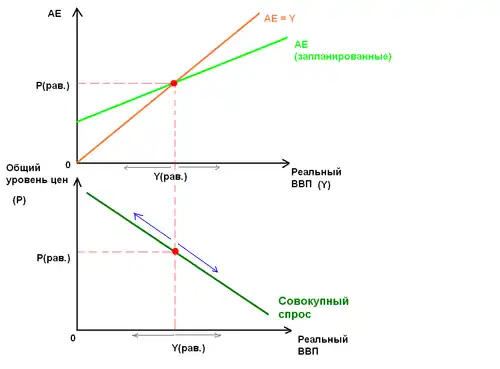 Джон Мейнард Кейнс предложил другое объяснение такой отрицательной зависимости. Он считал, что при увеличении уровня цен в экономике очевидно растёт величина спроса на деньги при неизменном спросе на реальные денежные остатки. Увеличение величины спроса на деньги, в свою очередь, провоцирует повышение реальной ставки процента. Рост банковской ставки процента по кредитам не приветствуют инвесторы, предпочитающие финансировать бизнес-проекты кредитами от банков, а не из собственного кармана. Таким образом, рост спроса на деньги отпугивает инвесторов, что, в свою очередь, ведёт к сокращению инвестиций в экономике. Следовательно, падает уровень выпуска.