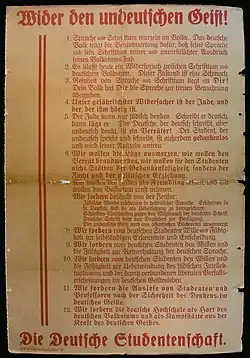 8 апреля студенческий союз также подготовил «Двенадцать тезисов против негерманского духа» (нем. Wider den undeutschen Geist!)[3], которые были призваны ассоциироваться с Мартином Лютером и историческим сожжением книг на Вартбургском празднестве, произошедшем в 1817 году в честь трёхсотлетия 95 тезисов Лютера. Текст тезисов публиковался в газетах и распространялся на листовках и плакатах, набранных красным готическим шрифтом.