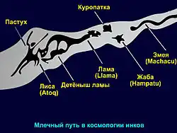 Главными объектами наблюдения в астрономии инков (что нашло отражение в их мифологии) были тёмные участки Млечного Пути — своеобразные «созвездия» в терминологии андских культур: Лама, Детёныш Ламы, Пастух, Кондор, Куропатка, Жаба, Змея, Лиса[11], а также другие объекты звёздного неба: Южный Крест, Плеяды, Лира и многие другие[12].