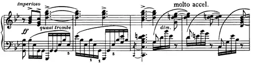 | 6 | 313-329 | В такте 313 отрывок из allegro fantastico завершается кульминацией, основанной на теме meno mosso. Фраза из четырёх тактов звучит три раза, каждый раз на квинту ниже, сначала ре-бемоль мажоре, затем в соль-бемоль мажоре и, наконец, в си-мажоре. Однако ожидаемая финальная кульминация прерывается повторным воспроизведением первой темы на пианиссимо. | ||