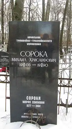 - 1 2 4 декабря исполняется 118 лет «командиру блокадного трамвая» Михаилу Сороке | Новости | СПб ГУП "Горэлектротранс". electrotrans.spb.ru. Дата обращения: 24 апреля 2023. Архивировано 22 января 2022 года.