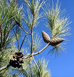 Почки узкояйцевидные, с красно-коричневыми чешуйками, покрытые беловатым опушением. Хвоя сохраняется на протяжении 2—4 лет. Хвоинки в пучках по 2, достигают 10—18 см в длину, сначала серо-зелёные, затем ярко-зелёные или жёлто-зелёные, с зазубренными краями.