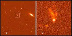 z = 0.695 | BeppoSAX | Первое рентгеновское послесвечение. Первое оптическое послесвечение. Определение красного смещения позволило сделать вывод о внегалактическом происхождении гамма-всплесков.[4] | ![]() | ||