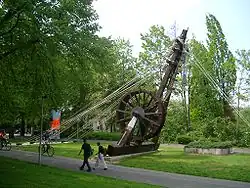 - Крупнейшим монолитом поднятым кранами был 108-тонный угловой блок карниза храма Юпитера в Баальбеке, а также блок архитрава весом в 63 т, оба блока были подняты на высоту примерно в 19 м.[69] Главный блок Колонны Траяна, весом 53,3 т был поднят на высоту около 34 м над землей.[70] Поскольку такие огромные грузы намного превышали подъемную способность любого одиночного журавлиного крана, предполагается что римские инженеры установили четырёхмачтовую подъемную башню, в середине которой каменные блоки были вертикально подняты с помощью кабестанов размещенных на земле вокруг.[71]