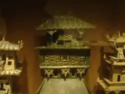 - Доугун: Доугун — это строительная консоль, которая является уникальной в китайской архитектуре. Начиная, по крайней мере, с династии Западная Чжоу (ок. 1050—771 до н. э.), она помещалась между верхней частью колонны и перекладиной для поддержки соединённых в пучок элементов вогнутой крыши здания. Доугун является основой китайской архитектуры.[110] Каждый доугун создаётся из двойных дугообразных кронштейнов (拱, гун), поддерживаемых с каждой стороны деревянными блоками (斗 доу). Доугун использовался также для декоративных и церемониальных, а не исключительно для прагматических целей поддержки, в частности, в кирпичных пагодах, как, например, в железной пагоде, построенной в 1049 году. В трактате по строительству Инцзао Фаши, опубликованном в 1103 году государственным деятелем Ли Цзе в эпоху династии Сун (960—1279) имеются многочисленные рисунки и описания доугуна.