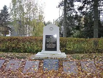 с 1997 до 2024 года[27]. Первоначальный бетонный советский памятник с другой надписью стоял перед зданием волостной управы, где также находится братская могила, современный памятник из валуна с чёрной гранитной плитой расположен к востоку от могилы на газоне и был установлен там в 1990-х годах. | ||