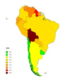 Ожидаемая продолжительность жизни при рождении в 2023 году согласно данным Группы Всемирного банка[2][3][4]. На общий список наложен фильтр согласно списку государств Южной Америки. Значения в таблицах Группы Всемирного банка округлённые. Все вычисления проведены на неокруглённых данных, поэтому, вследствие нюансов округления, в некоторых местах возникли кажущиеся нестыковки индикаторов размером в 0,01 года.