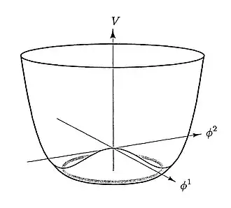 где , . Этот лагранжиан инвариантен относительно замены [14]. Поле в этом случае имеет два вакуума, что соответствует наличию у потенциальной энергии двух минимумов при ; однако ни один из вакуумов не является инвариантным относительно начальной симметрии инверсии знака поля. В этом и заключается спонтанное нарушение симметрии[15]: здесь инверсия не является калибровочным преобразованием. Благодаря симметрии лагранжиана относительно инверсии знака поля (чётности) можно выбрать любой знак вакуума. Не умаляя общности, можно выбрать «». Разложив поле в окрестности вакуумного состояния и считая малой величиной, лагранжиан можно записать[16] в виде