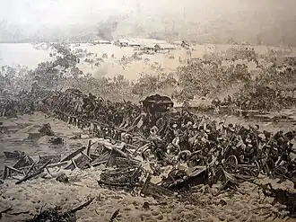 Ближе к вечеру 28 ноября на собравшуюся у переправы 40-тысячную толпу стали сыпаться ядра артиллерии Витгенштейна. Толпы людей кинулись к мостам. Один из мостов под напором бегущих по нему многих тысяч людей не выдержал и рухнул. В создавшемся беспорядке переправа застопорилась, люди, столпившие на берегу, по свидетельству очевидца, погибали в давке и от удушья. В это человеческое скопище продолжали падать многочисленные русские ядра и бомбы. В ужасе тысячи французов бросились в ледяную воду Березины, пытаясь вплавь перебраться на другой берег, но гибли, захлебываясь в холодной воде, а также от огня русской артиллерии.