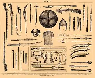 - Европа. Первоначально развивается во многом благодаря Римской империи, складывается европейский арсенал, на который оказывает влияние западноазиатское оружие (сабли, огнестрельное оружие). Сюда же входит Русь.