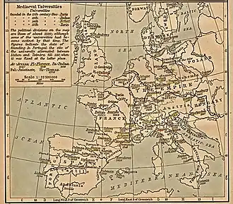 Первые университеты XII века создавались на базе соборных школ Франции (Шартр, Лан) и Италии (Павия, Равенна, Болонья). Университеты могли быть созданы волевым решением епископата (Тулуза) или светских властей (Саламанка, Неаполь), изредка корпорация возникала спонтанно на базе старого образовательного центра (Париж, Оксфорд, Монпелье). Многие прославленные школы XII века зачахли, так и не превратившись в университеты (Салернская врачебная школа). Иногда происходила сецессия — так возникли Падуанский и Кембриджский университеты. В XIII веке университеты основывались по-прежнему папами и королями, причём кастильский король Альфонсо X впервые уделил место университетскому образованию в законодательстве. Большое число новых университетов возникло в XIV веке как результат Авиньонской схизмы — сторонники пап и антипап активно создавали свои учебные заведения. Некоторые университеты оказывались эфемерными (Печ), а некоторым требовалось несколько десятилетий для развития (Вена, Краков). Существовали две «семьи» университетских уставов — Парижская (северная) и Болонская (южная), из которых северная преобладала, и парижские уставы и учебные программы принимали практически во всех вновь основанных университетах. В XV столетии университеты утратили общеевропейский статус и автономию от властей. При этом ни одно самостоятельное европейское государство не могло обойтись без университета; в частности, в Бургундском герцогстве их было основано два, в том числе Лувенский. К концу XV века по всей Европе, включая Скандинавию, существовало 86 университетов[5]. Между 1348 и 1500 годами в Священной Римской империи было основано 13 университетов, первым из которых был Пражский[6].