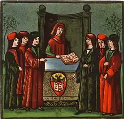 Университе́т (лат. universitas) — учебная корпорация Средних веков. Возникновение и распространение университетов впервые происходило во время возрождения двенадцатого века. Основной функцией корпорации было присуждение учёных степеней, важнейшей из которых была licentia ubique docendi — «право преподавания повсюду». Это отличало университет как высшую школу: присуждённая степень признавалась по всей Европе, гарантом чего выступала папская или императорская власть. Это делало университеты важнейшими сторонниками сохранения европейского единства[2]. Европейская университетская система со своими специфическими особенностями сложилась приблизительно к 1200 году[3]. В течение XV века началась перестройка учебного и научного процесса под влиянием гуманизма; в социальном отношении это было также связано с аристократизацией состава преподавателей и студентов. В историографии сложилось представление, что 1500 год является разделительной линией в развитии европейского высшего образования и университетов вообще[4].