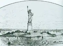 Вдохновлённый увиденным, Бартольди сделал акварельный набросок, сохранившийся до наших дней. На нём изображена статуя Свободы, значительно отличающаяся от своей современной версии. На эскизе в левой руке статуи изображена разбитая ваза, древний символ рабства, которая позднее была заменена на табличку с начертанием даты принятия Декларации независимости. Кроме того, изменения претерпели местоположение статуи в пределах острова и форма пьедестала. В ходе поездки Бартольди познакомился с журналистом Хорасом Грили, писателем Джорджем Кёртисом и поэтом Генри Лонгфелло, которые выразили свою поддержку проекту. Скульптору также удалось заручиться одобрением президента Улисса Гранта[14]. 4 июля 1871 года, по прибытии в Вашингтон, Бартольди встретился с сенатором от Массачусетса Чарльзом Самнером[15]. В письме де Лабулэ он писал: «Я ищу людей, желающих принять участие в реализации нашего проекта, и я нашёл достаточное число таковых». Особую роль в последующей реализации идеи сыграло возобновление контактов с Джоном Лафаржем, с которым Бартольди познакомился ещё в Париже. Впоследствии Лафарж предоставил скульптору свою студию в Ньюпорте, где в течение следующего десятилетия Бартольди работал над статуей. В ходе своего путешествия, помимо Нью-Йорка, Бостона и Вашингтона[16], скульптор побывал в Чикаго, Питтсбурге, Сент-Луисе, Денвере, Солт-Лейк-Сити, Сакраменто и Сан-Франциско. Осенью 1871 года он вернулся во Францию[17].